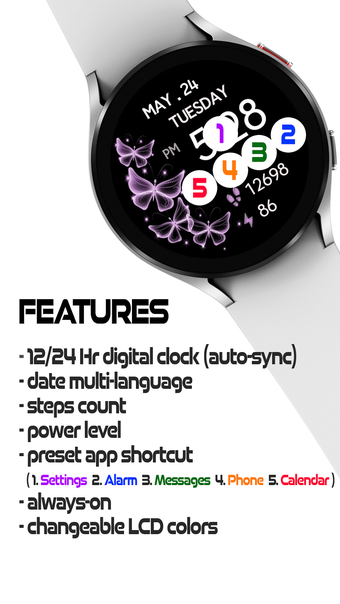 Butterfly Bloom Watch Face werkt op Android 9.0 en hoger. De huidige versie van de software is 1.9 en je kunt deze krijgen in het Engels, Duits en Hindi.